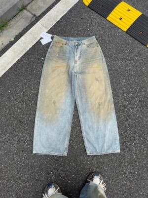 가죽 뒤 포켓 보카시 와이드 워싱 구제 남녀 청바지