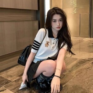 학원풍 곰돌이 자수 커플용 폴로 셔츠 흰색
