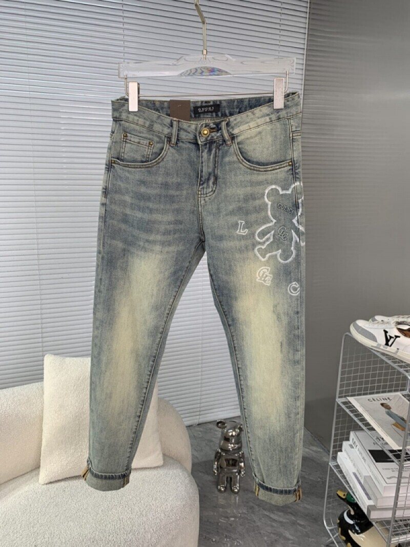 복고풍 곰 패턴 워싱 청바지 블루