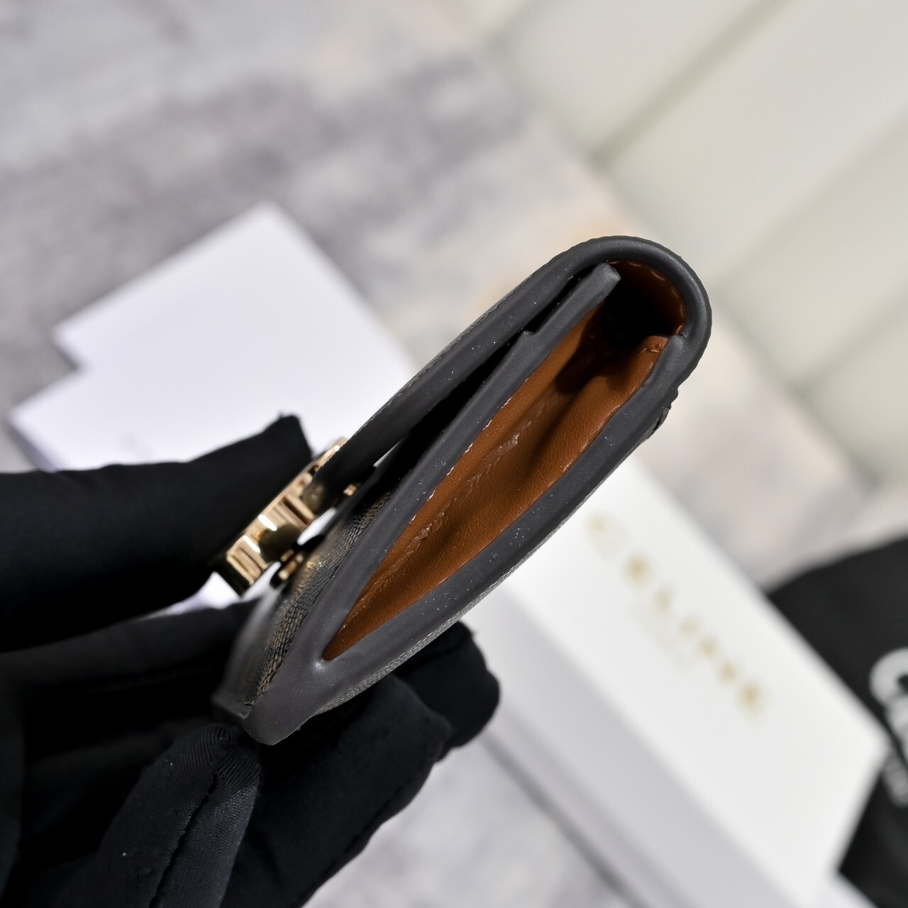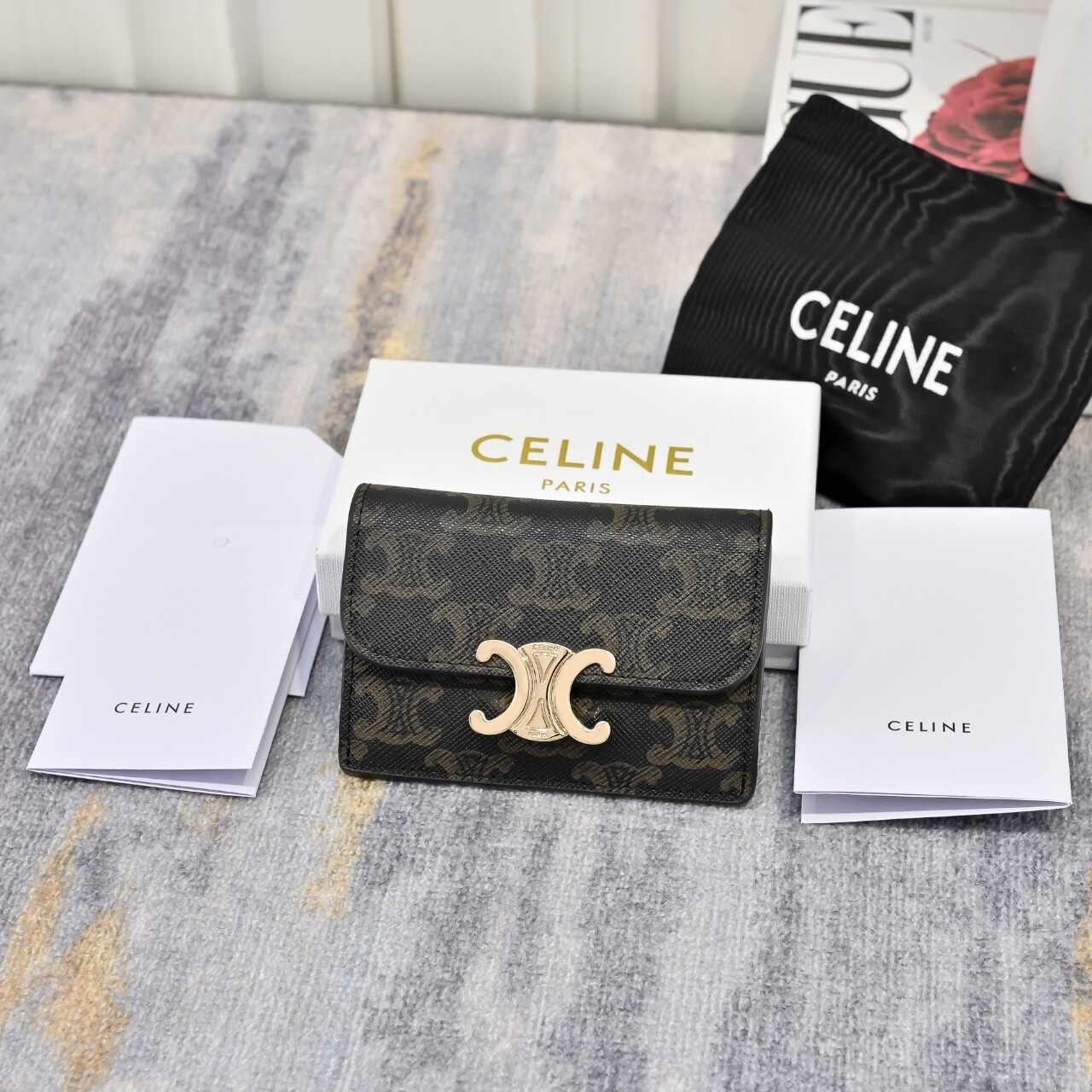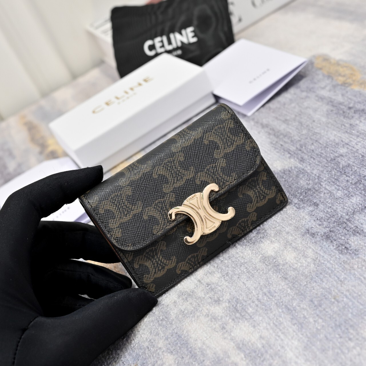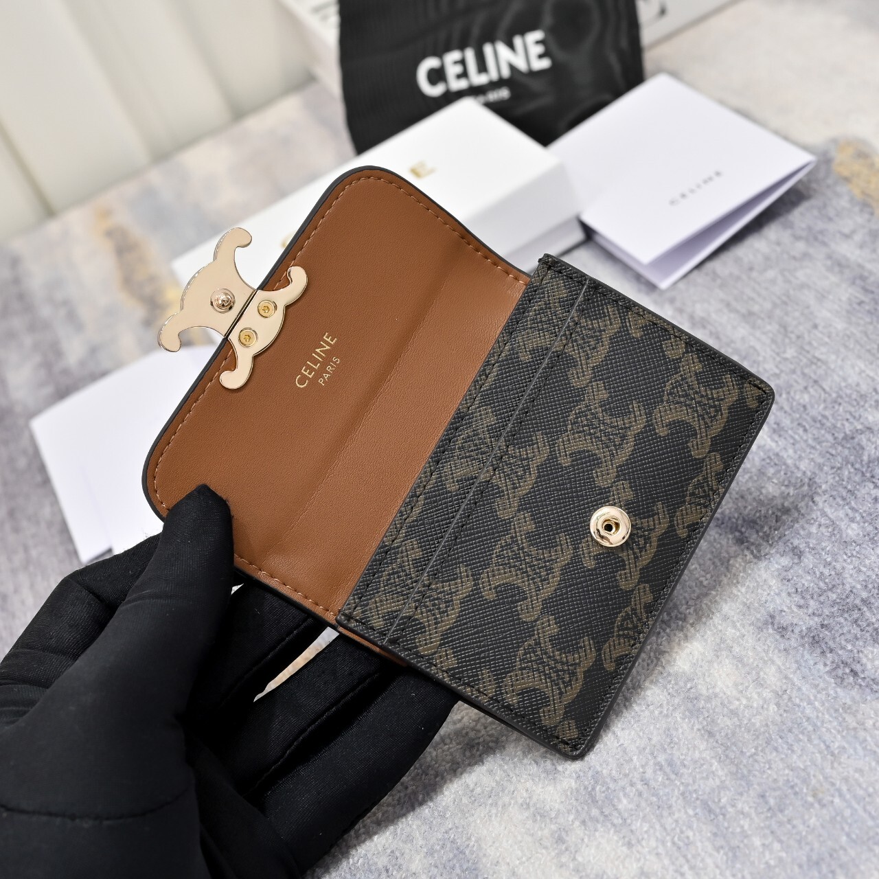 셀린느 플랩 카드지갑 탄(10I582CPJ.04LU)풀박칼 라 : 탄사이즈 : 10.5 X 7 X 1cm(가로 × 높이 × 너비) 사 양 : 메인 수납공간 1개, 내부 신용 카드 슬롯 2개, 내부 플랫 포켓 1개, 외부 플랫 포켓 1개